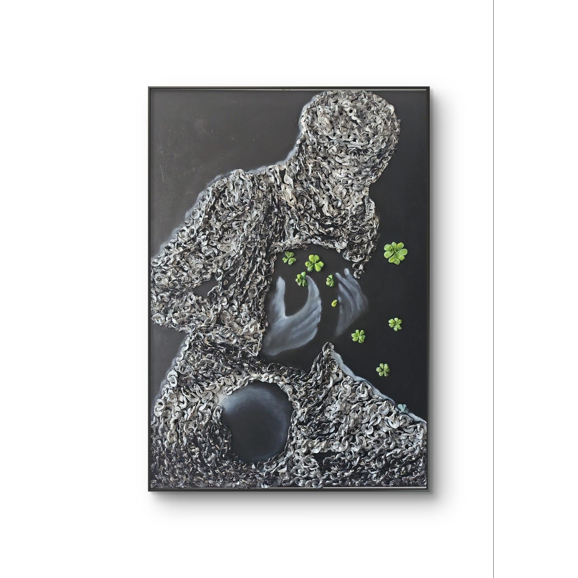 Una possibile interpretazione potrebbe essere che la libertà non sia solo una condizione predeterminata, ma piuttosto una scelta che ogni individuo deve compiere consapevolmente. Le catene rappresentano le restrizioni esterne che limitano le nostre azioni, ma la vera libertà può essere ottenuta solo quando si agisce in base alla propria coscienza e si fa una scelta consapevole, simboleggiata dalla selezione del quadrifoglio come emblema di fortuna e libertà.