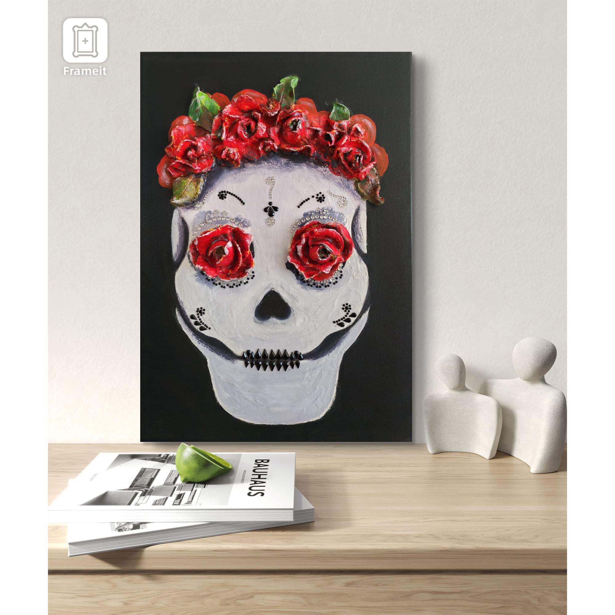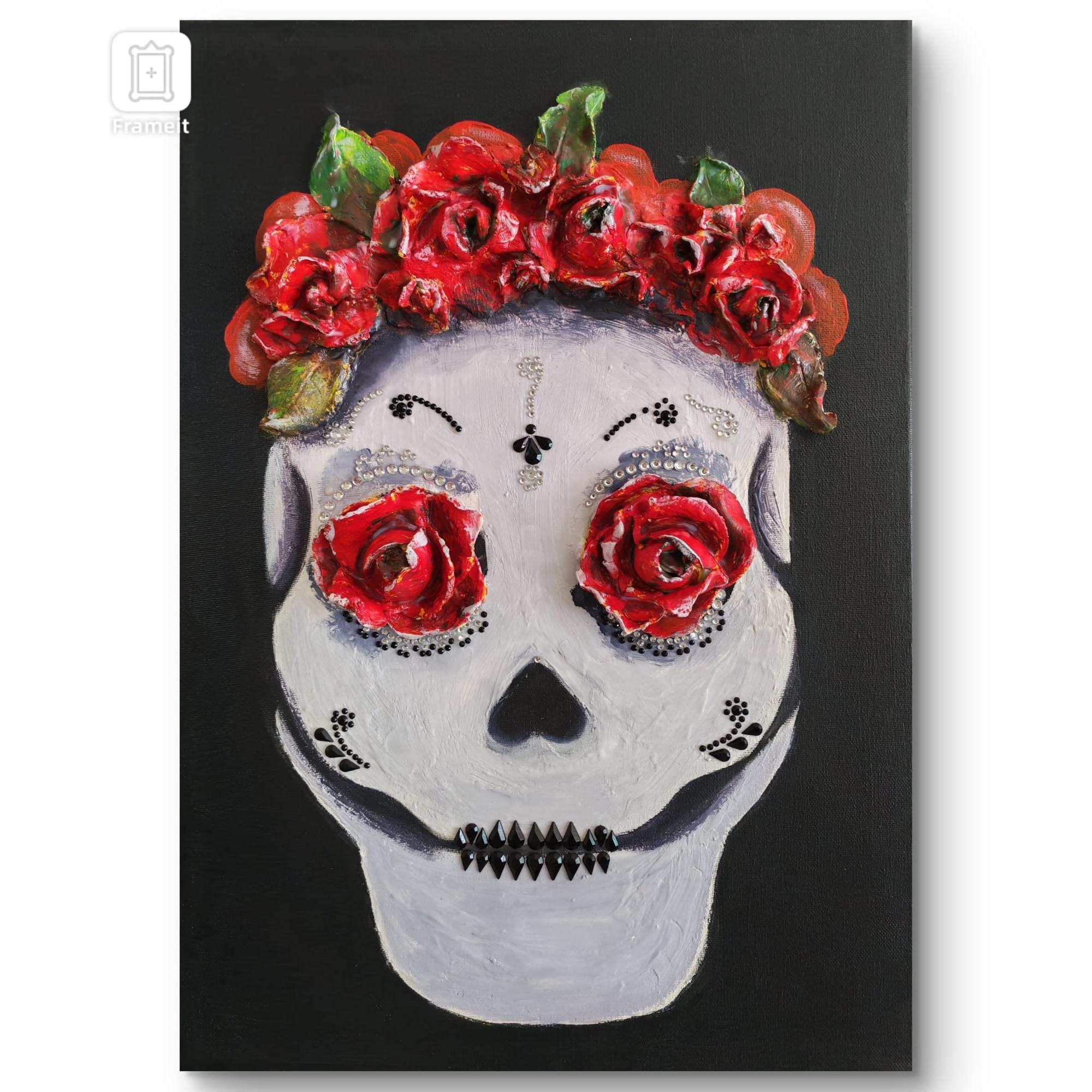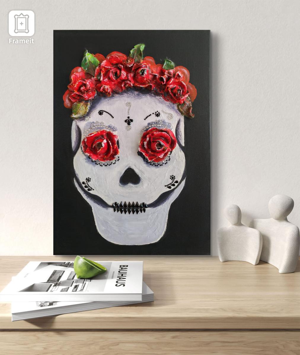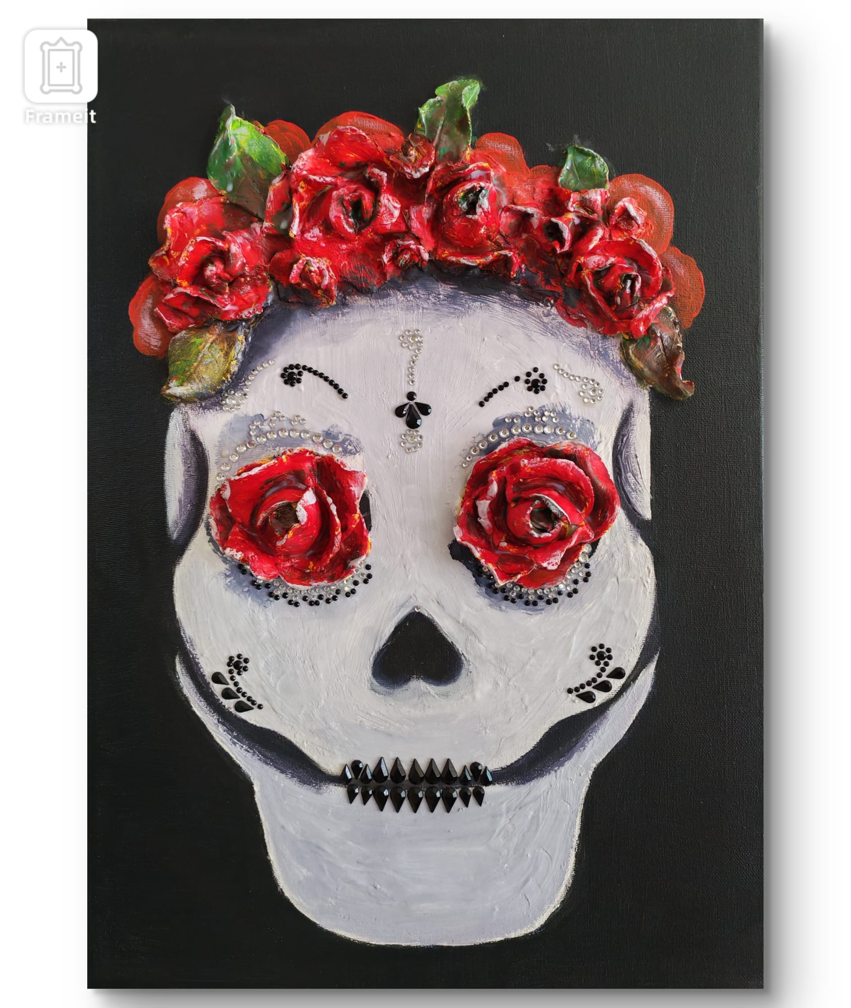 La calavera, icono de la tradición mexicana, no anuncia muerte sino celebración. Las rosas quellenan los ojos transforman la ausencia en belleza, recordando que la memoria florece incluso en laoscuridad. Una obra que une vida, identidad y homenaje.