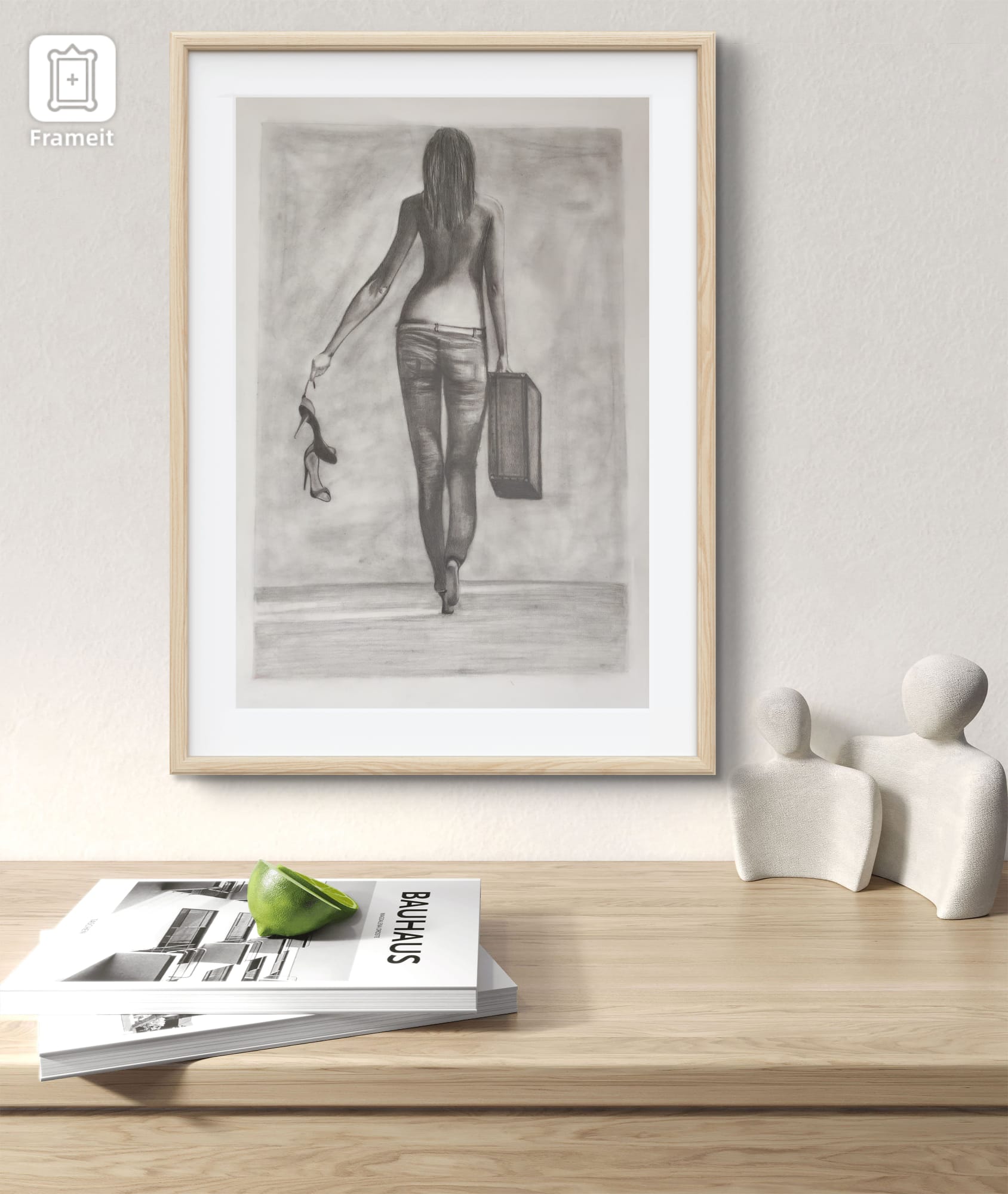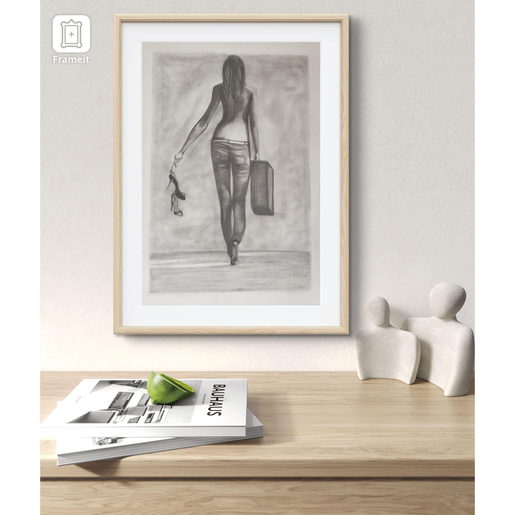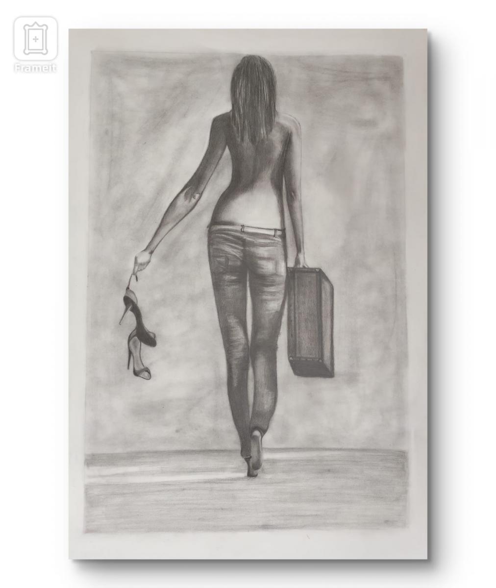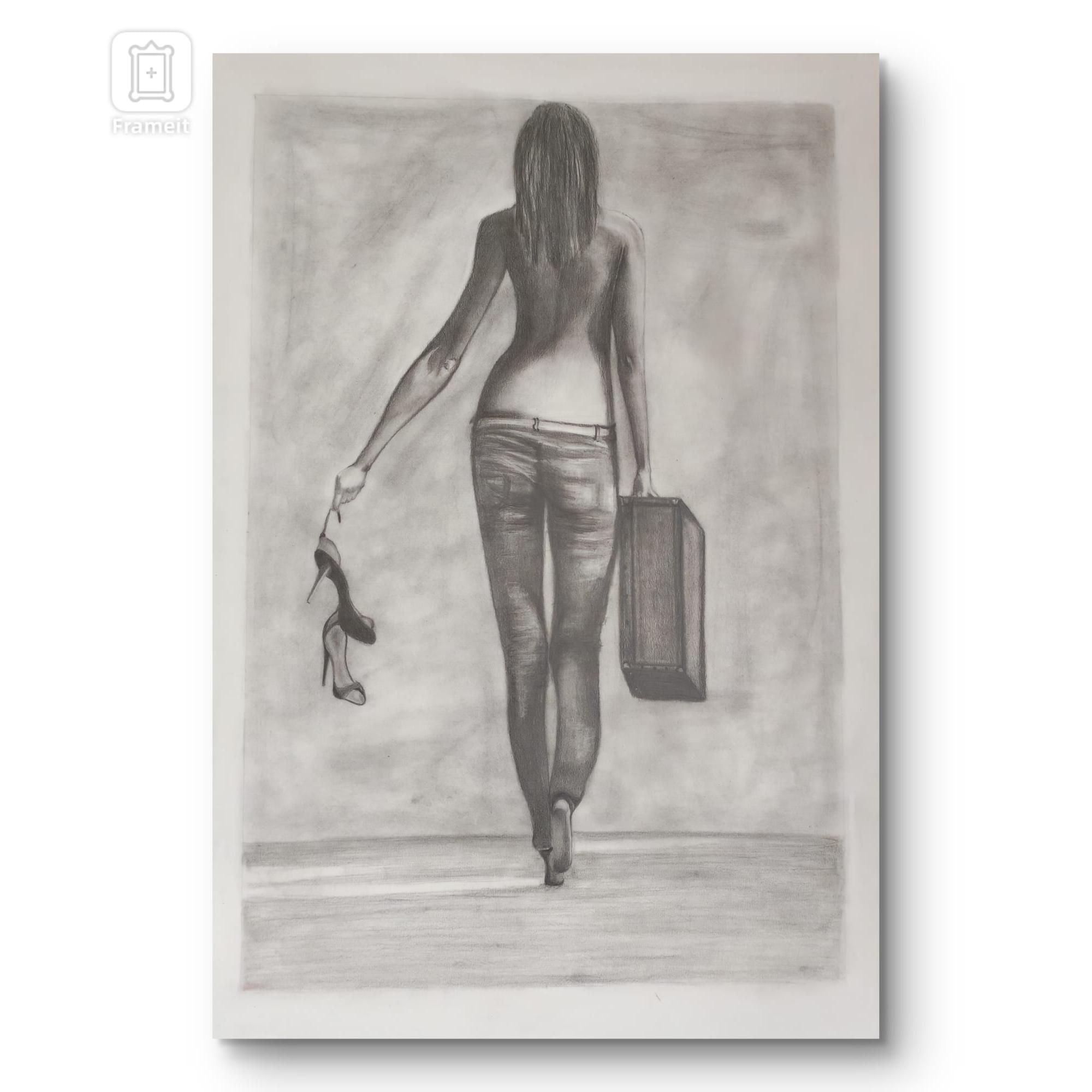 Una mujer avanza sin mirar atrás, cargando una maleta en una mano y sus zapatos en la otra.El grafito resalta la fuerza silenciosa de su gesto: dejar atrás lo que pesa para seguir su propio camino.La escena captura un momento de decisión y libertad, donde cada paso afirma una nueva identidad.
