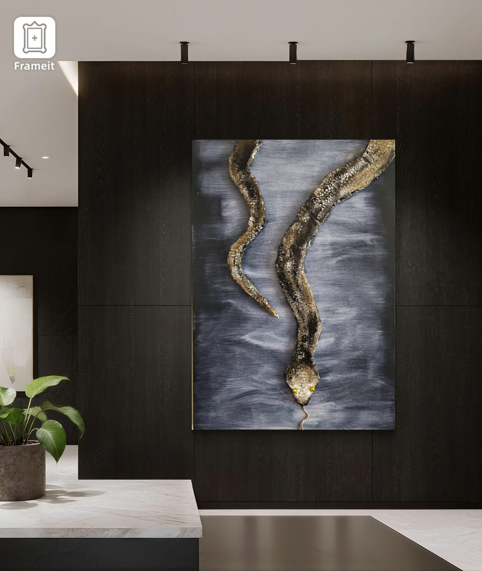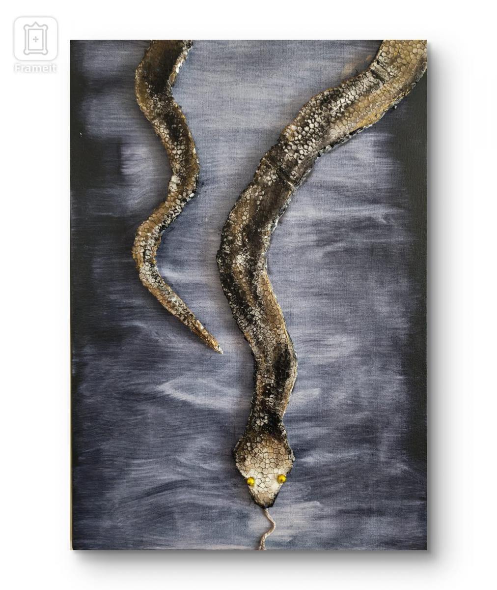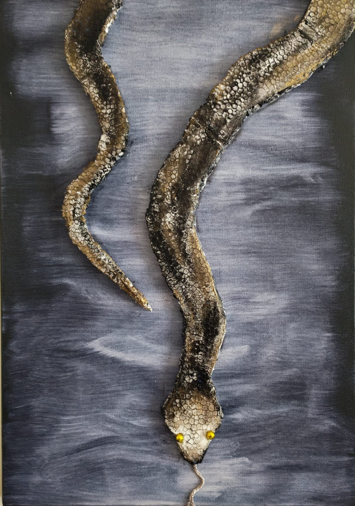 La serpiente avanza con su piel mudada, símbolo ancestral de transformación. La textura realintensifica la sensación de un cuerpo que ha cambiado, que ha dejado atrás lo que ya no sirve.Una metáfora poderosa del renacimiento personal: avanzar, desprenderse, volver a empezar