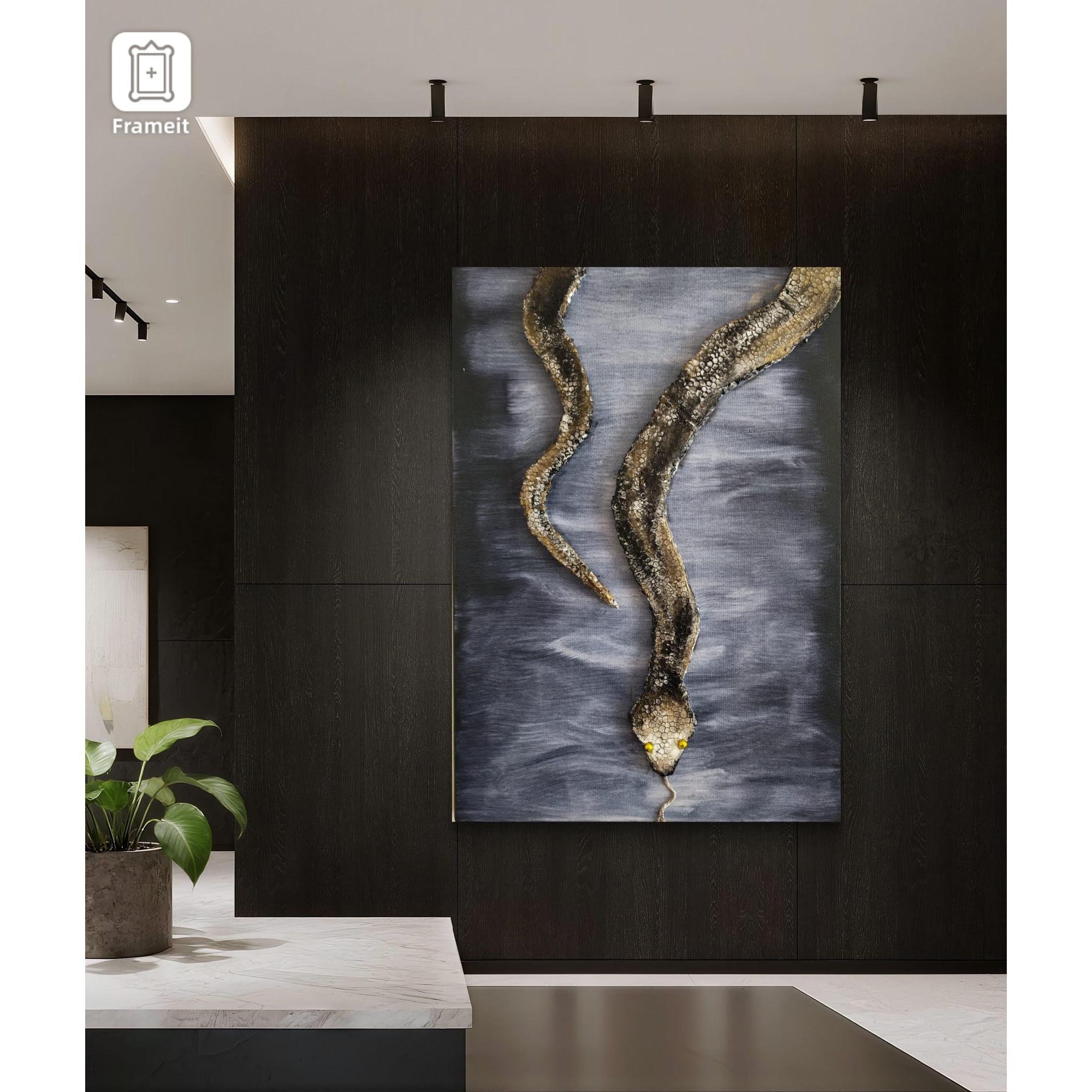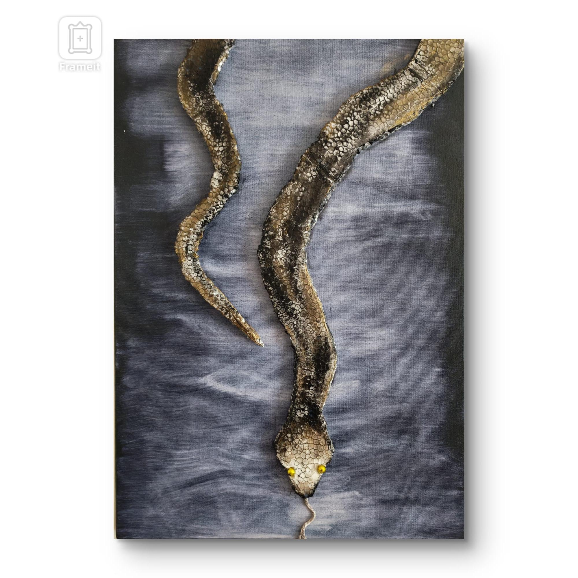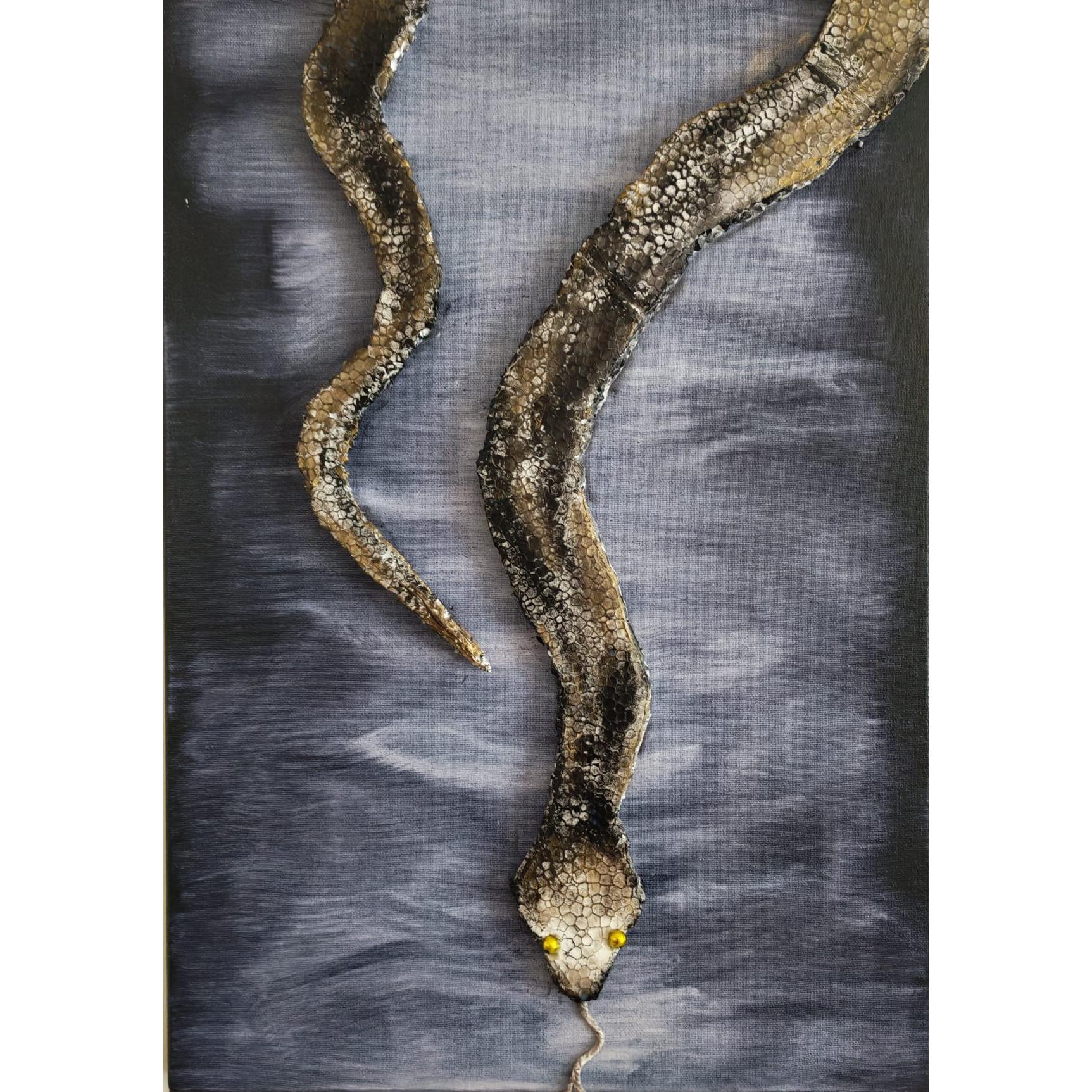 La serpiente avanza con su piel mudada, símbolo ancestral de transformación. La textura realintensifica la sensación de un cuerpo que ha cambiado, que ha dejado atrás lo que ya no sirve.Una metáfora poderosa del renacimiento personal: avanzar, desprenderse, volver a empezar