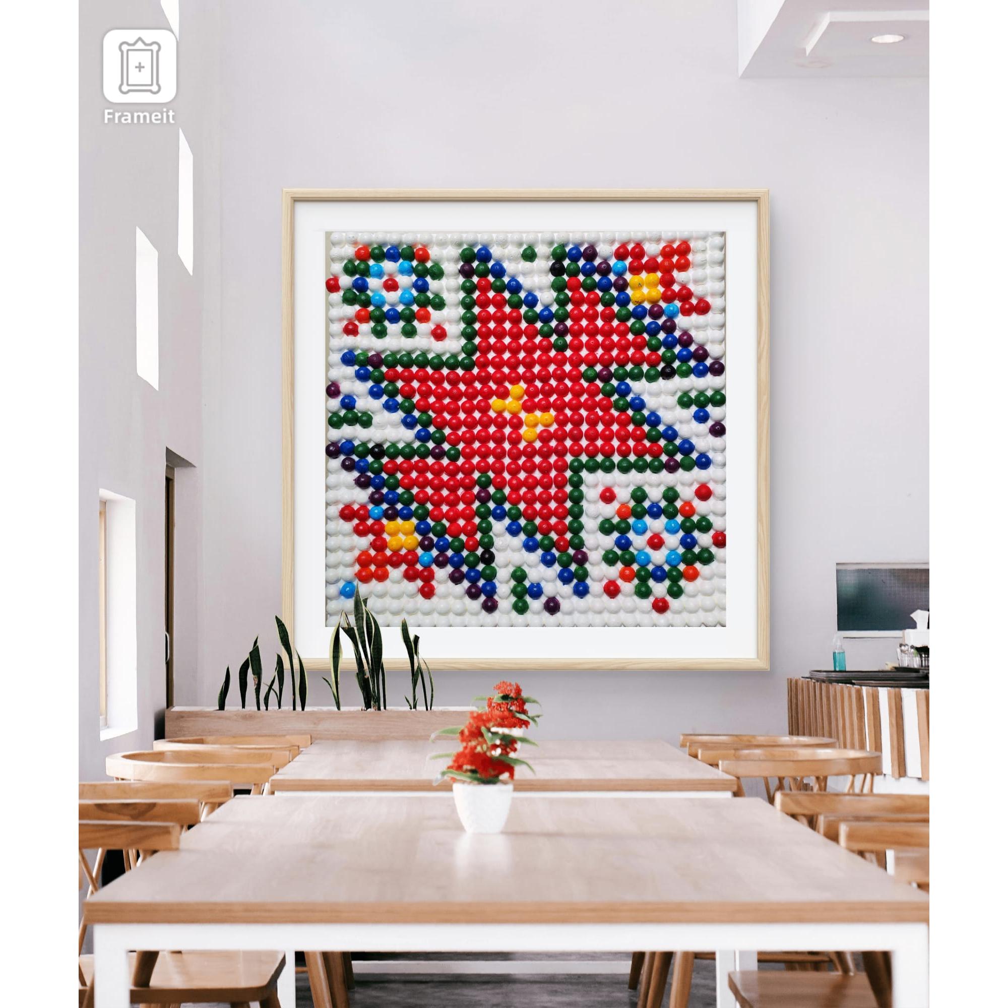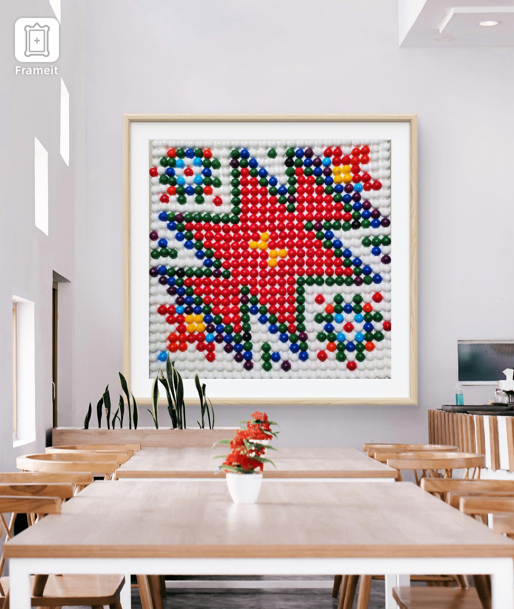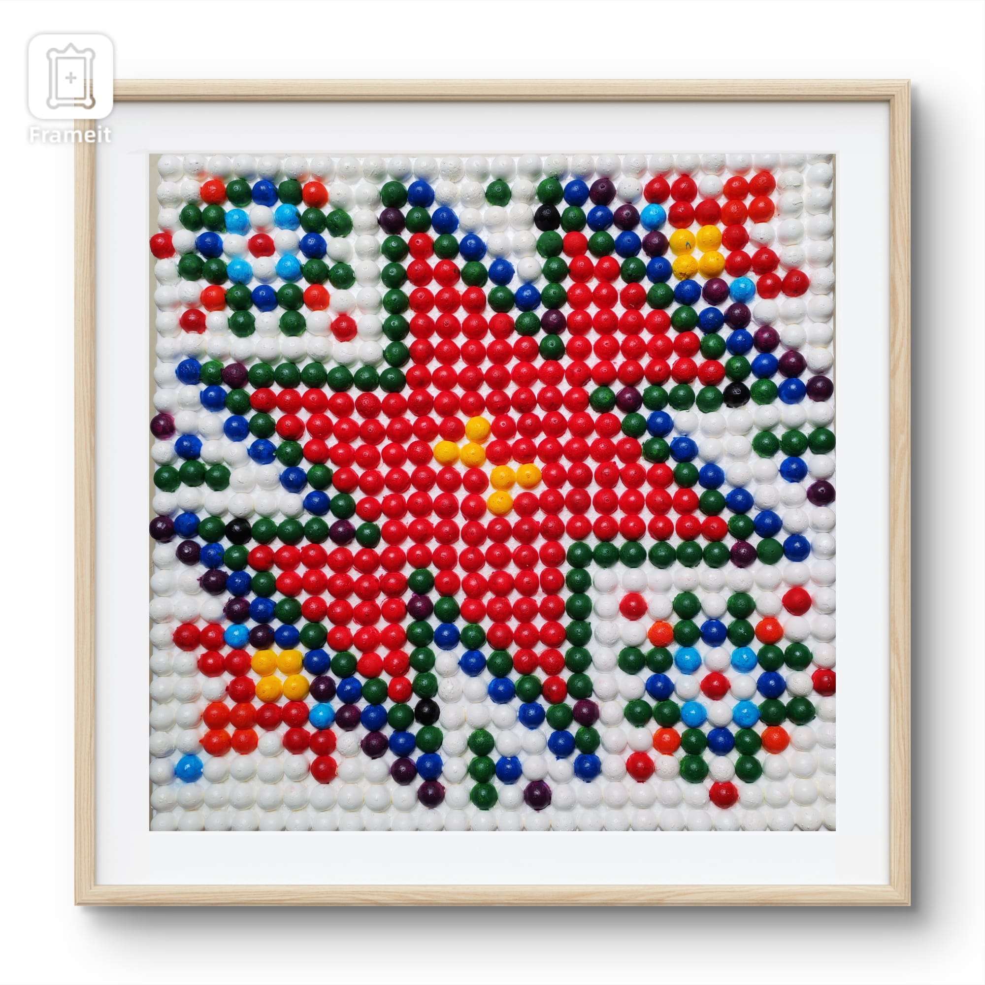 La flor emerge a partir de pequeñas piezas de colores que se unen como un mosaico contemporáneo.Cada punto aporta brillo y energía, creando un diseño que recuerda a los bordados tradicionales reinterpretados en clave moderna.La obra celebra la alegría del color y la belleza que nace de los detalles.
