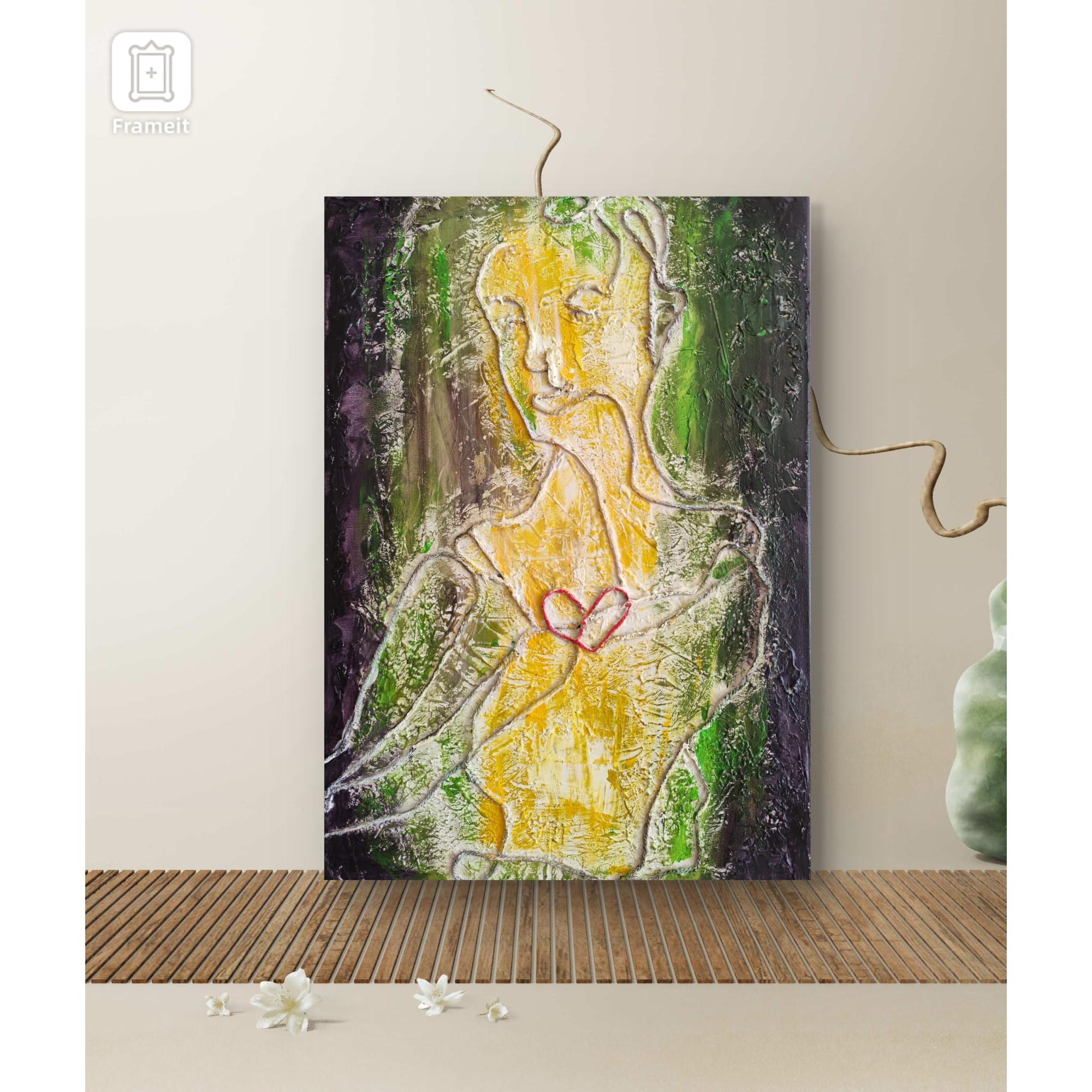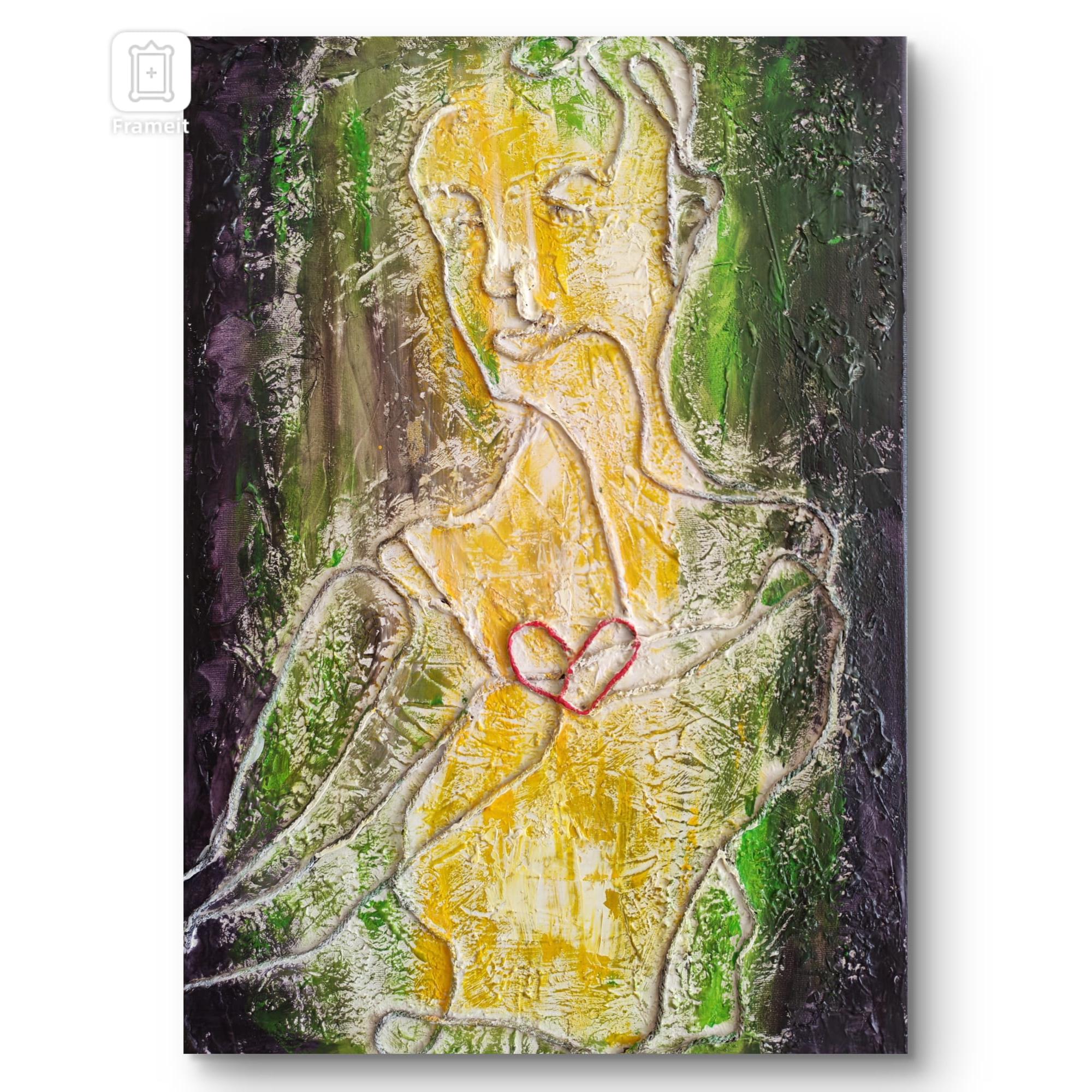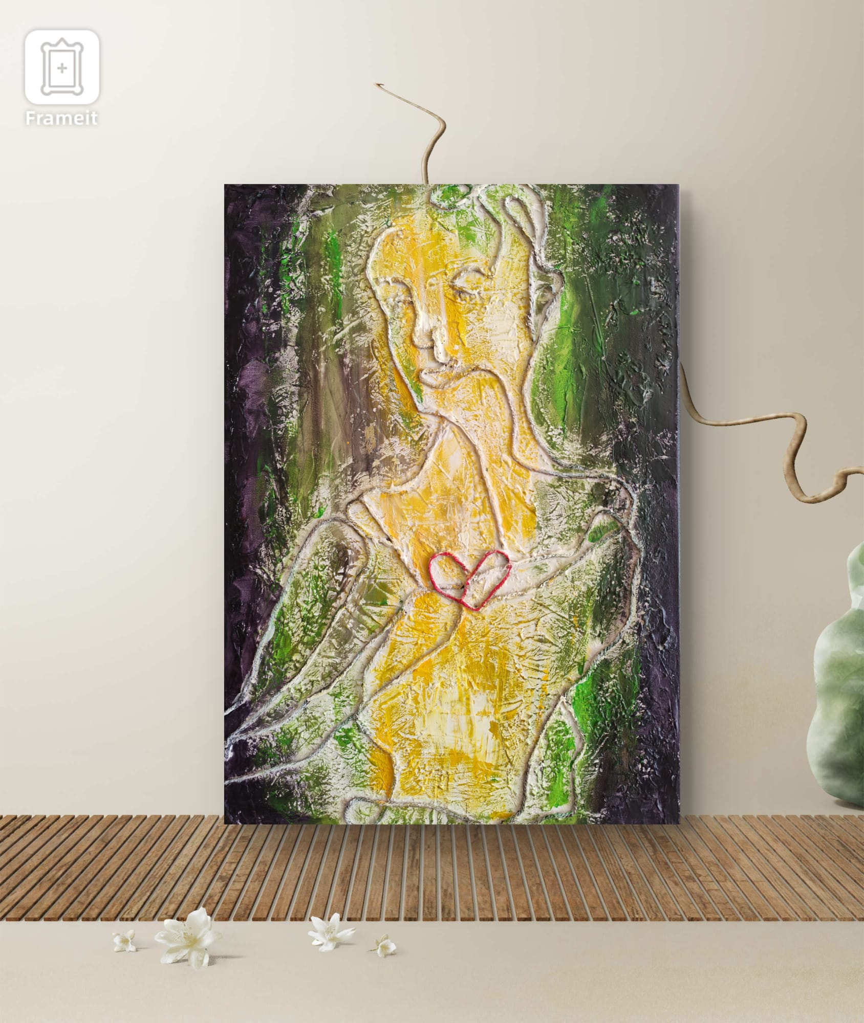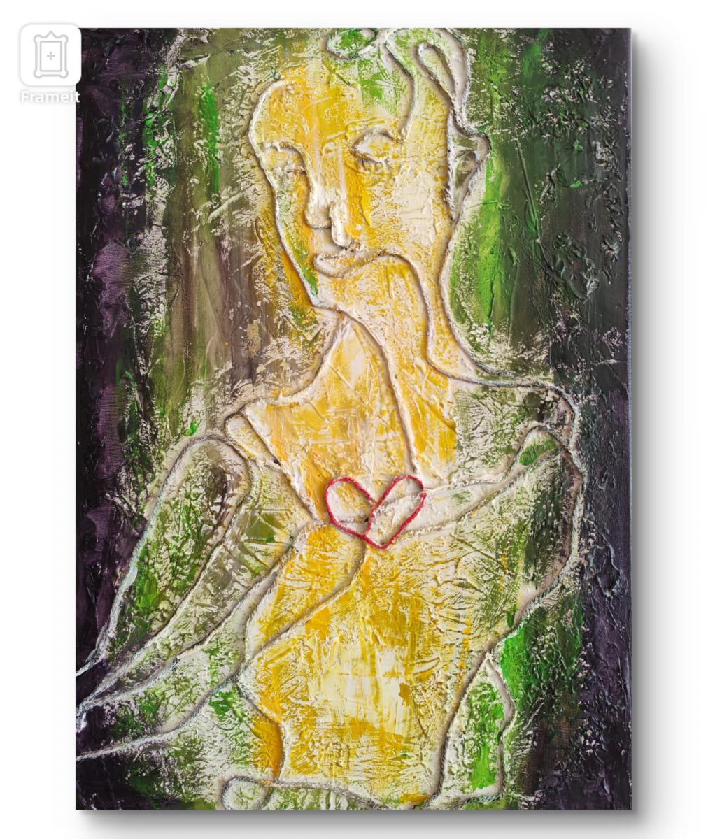 La figura emerge de la materia como un recuerdo cálido. El amarillo, color de vitalidad, envuelve uncorazón delineado que palpita en el centro de la composición. La obra habla de ternura, fragilidad yla fuerza emocional que nos sostiene.